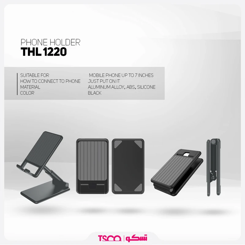 پایه نگهدارنده یا هولدر رومیزی تسکو مدل THL 1220 محصول جدیدی از شرکت تسکو با وزن کم و ابعاد مناسب برای انواع گوشی 3 تا 6.5 اینچ می باشد که به دلیل جنس بدنه آلمینیومی حس بسیار خوبی را به کاربر در زمان استفاده می دهد.